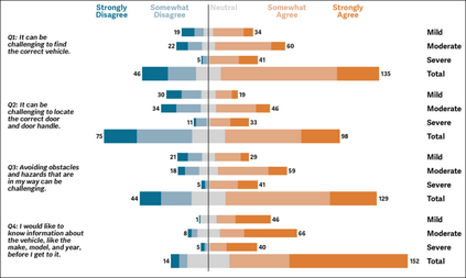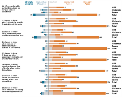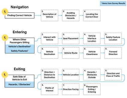 Purpose: Autonomous vehicles (AVs) are becoming a promising transportation solution for blind and low-vision (BLV) travelers, offering the potential for greater independent mobility. This paper explores the information needs of BLV users across multiple steps of the transportation journey, including finding and navigating to, entering, and exiting vehicles independently. Methods: A survey with 202 BLV respondents and interviews with 12 BLV individuals revealed the perspectives of BLV end-users and informed the sequencing of natural language information required for successful travel. Whereas the survey identified key information needs across the three trip segments, the interviews helped prioritize how that information should be presented in a sequence of accessible descriptions to travelers. Results: Taken together, the survey and interviews reveal that BLV users prioritize knowing the vehicle's make and model and how to find the correct vehicle during the navigation phase. They also emphasize the importance of confirmations about the vehicle's destination and onboard safety features upon entering the vehicle. While exiting, BLV users value information about hazards and obstacles, as well as knowing which side of the vehicle to exit. Furthermore, results highlight that BLV travelers desire using their own smartphone devices when receiving information from AVs and prefer audio-based interaction. Conclusion: The findings from this research contribute a structured framework for delivering trip-related information to BLV users, useful for designers incorporating natural language descriptions tailored to each travel segment. This work offers important contributions for sequencing transportation-related descriptions throughout the AV journey, ultimately enhancing the mobility and independence of BLV individuals.