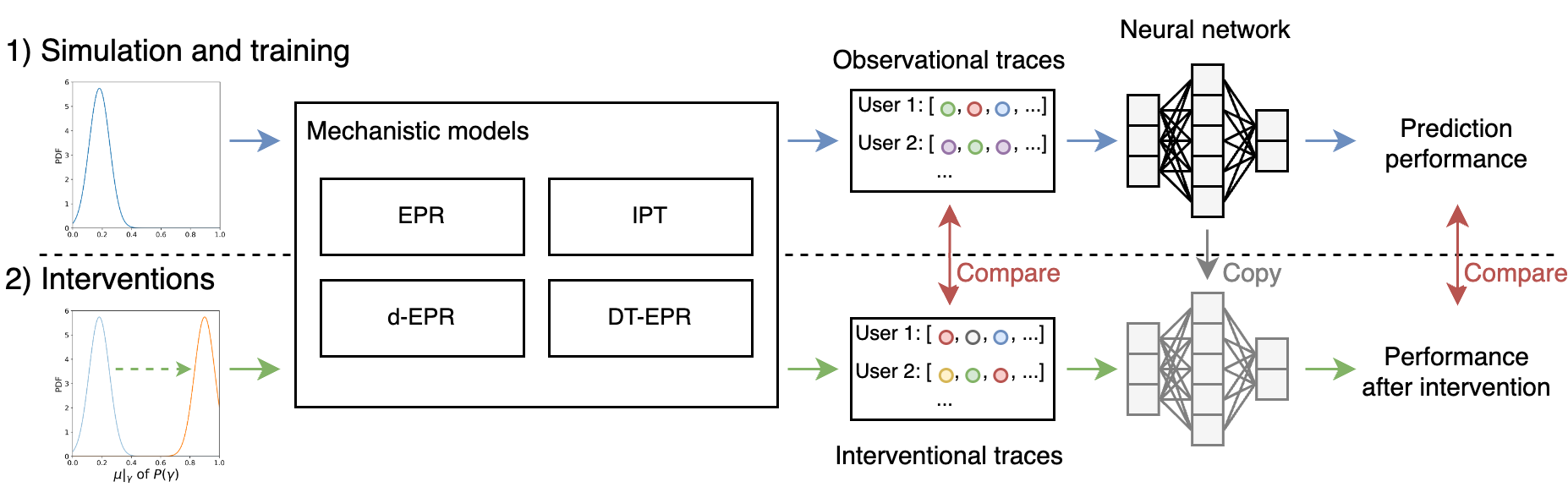 Deep neural networks are increasingly utilized in mobility prediction tasks, yet their intricate internal workings pose challenges for interpretability, especially in comprehending how various aspects of mobility behavior affect predictions. This study introduces a causal intervention framework to assess the impact of mobility-related factors on neural networks designed for next location prediction -- a task focusing on predicting the immediate next location of an individual. To achieve this, we employ individual mobility models to synthesize location visit sequences and control behavior dynamics by intervening in their data generation process. We evaluate the interventional location sequences using mobility metrics and input them into well-trained networks to analyze performance variations. The results demonstrate the effectiveness in producing location sequences with distinct mobility behaviors, thereby facilitating the simulation of diverse yet realistic spatial and temporal changes. These changes result in performance fluctuations in next location prediction networks, revealing impacts of critical mobility behavior factors, including sequential patterns in location transitions, proclivity for exploring new locations, and preferences in location choices at population and individual levels. The gained insights hold value for the real-world application of mobility prediction networks, and the framework is expected to promote the use of causal inference to enhance the interpretability and robustness of neural networks in mobility applications.