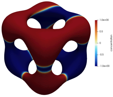 This paper addresses the analysis and numerical assessment of a computational method for solving the Cahn--Hilliard equation defined on a surface. The proposed approach combines the stabilized trace finite element method for spatial discretization with an implicit--explicit scheme for temporal discretization. The method belongs to a class of unfitted finite element methods that use a fixed background mesh and a level-set function for implicit surface representation. We establish the numerical stability of the discrete problem by showing a suitable energy dissipation law for it. We further derive optimal-order error estimates assuming simplicial background meshes and finite element spaces of order $m \geq 1$. The effectiveness of the method is demonstrated through numerical experiments on several two-dimensional closed surfaces, confirming the theoretical results and illustrating the robustness and convergence properties of the scheme.