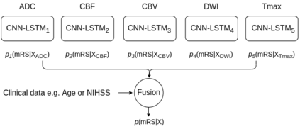 翻译:临床结果预测在中风病人管理中起着重要作用。 从机器学习角度看,主要挑战之一是病人入院时的多种数据,即多维图像数据,以及卡路里临床数据。在本文中,提出了基于长期短期记忆(CNN-LSTM)的多式进化神经网络模型。对于每个MR图像模块,一个专门的网络利用修改的Ranin尺度,对临床结果进行初步预测。通过将每个模块的初步概率与每个模块用于特定类型MR图像的初步概率结合起来,根据临床元数据加权,即本地年龄或国家卫生系统规模(NIHSSS),获得最后的MS分数。实验结果表明,拟议的模型超过了基线,为在深层学习结构中自动编码MSM图像的波段-时空环境提供了一种原始方法。与NIHSS相比,拟议模型实现了最高AUC(0.77)。