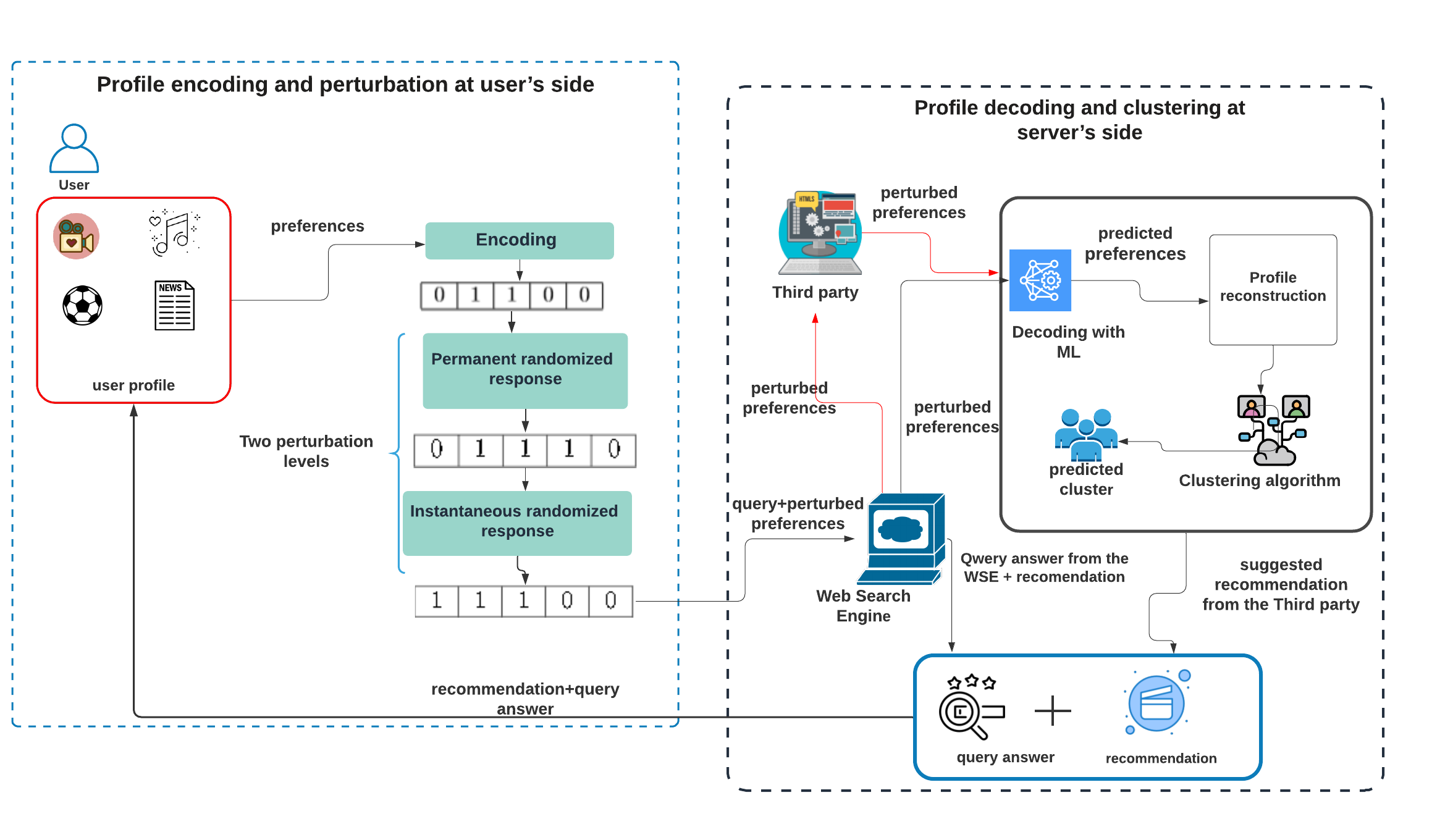 This paper proposes a new recommendation system preserving both privacy and utility. It relies on the local differential privacy (LDP) for the browsing user to transmit his noisy preference profile, as perturbed Bloom filters, to the service provider. The originality of the approach is multifold. First, as far as we know, the approach is the first one including at the user side two perturbation rounds - PRR (Permanent Randomized Response) and IRR (Instantaneous Randomized Response) - over a complete user profile. Second, a full validation experimentation chain is set up, with a machine learning decoding algorithm based on neural network or XGBoost for decoding the perturbed Bloom filters and the clustering Kmeans tool for clustering users. Third, extensive experiments show that our method achieves good utility-privacy trade-off, i.e. a 90$\%$ clustering success rate, resp. 80.3$\%$ for a value of LDP $\epsilon = 0.8$, resp. $\epsilon = 2$. Fourth, an experimental and theoretical analysis gives concrete results on the resistance of our approach to the plausible deniability and resistance against averaging attacks.