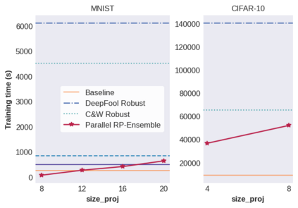 We propose two training techniques for improving the robustness of Neural Networks to adversarial attacks, i.e. manipulations of the inputs that are maliciously crafted to fool networks into incorrect predictions. Both methods are independent of the chosen attack and leverage random projections of the original inputs, with the purpose of exploiting both dimensionality reduction and some characteristic geometrical properties of adversarial perturbations. The first technique is called RP-Ensemble and consists of an ensemble of networks trained on multiple projected versions of the original inputs. The second one, named RP-Regularizer, adds instead a regularization term to the training objective.