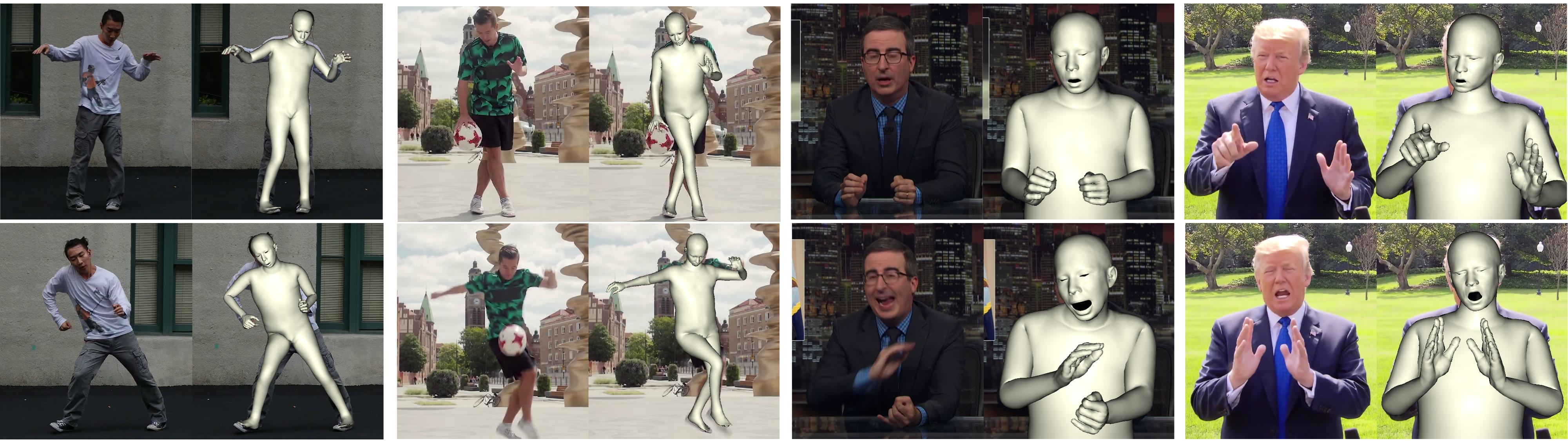 We present the first method to capture the 3D total motion of a target person from a monocular view input. Given an image or a monocular video, our method reconstructs the motion from body, face, and fingers represented by a 3D deformable mesh model. We use an efficient representation called 3D Part Orientation Fields (POFs), to encode the 3D orientations of all body parts in the common 2D image space. POFs are predicted by a Fully Convolutional Network (FCN), along with the joint confidence maps. To train our network, we collect a new 3D human motion dataset capturing diverse total body motion of 40 subjects in a multiview system. We leverage a 3D deformable human model to reconstruct total body pose from the CNN outputs by exploiting the pose and shape prior in the model. We also present a texture-based tracking method to obtain temporally coherent motion capture output. We perform thorough quantitative evaluations including comparison with the existing body-specific and hand-specific methods, and performance analysis on camera viewpoint and human pose changes. Finally, we demonstrate the results of our total body motion capture on various challenging in-the-wild videos. Our code and newly collected human motion dataset will be publicly shared.