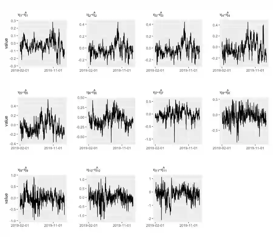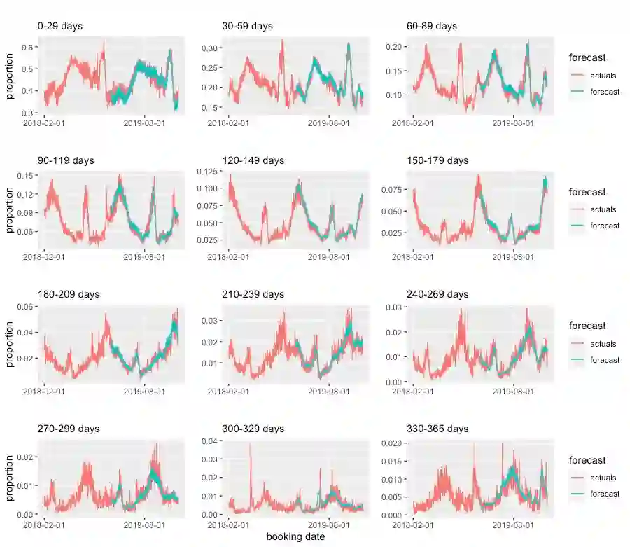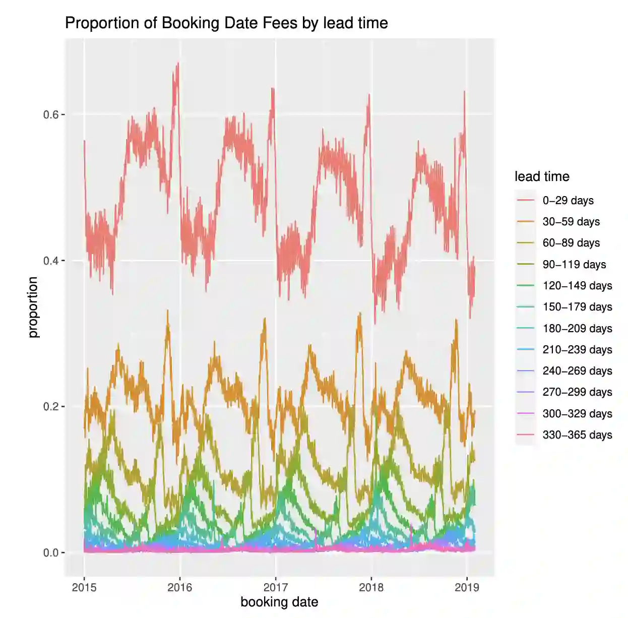 翻译:领先时间数据是酒店行业中经常遇到的组成数据。酒店企业每天都会收取费用,但这些费用必须延迟才能确认收入。为了分配资源,制定商业计划和人力安排,理解和预测未来费用的分布非常重要。在对过去5年的日费用数据进行研究后,我们提出了一类新的贝叶斯时间序列模型——泊松狄利克雷自回归移动平均模型,用于建模未来连续11个30天窗口和1个最后连续35天窗口中将认可的未来费用的比例数据。每天的组成数据都有一个狄利克雷分布,给定均值和比例尺参数。均值通过矢量自回归移动平均过程进行建模,在添加对数比率链接函数进行转换后依赖于先前的组成数据、先前的组成参数和日常协变量。该泊松狄利克雷自回归移动平均模型提供了解决大组成向量和短或长时间序列的数据分析问题的方案,通过选择先验提供效率增益,为推理提供可解释参数,并可作出合理的预测。
