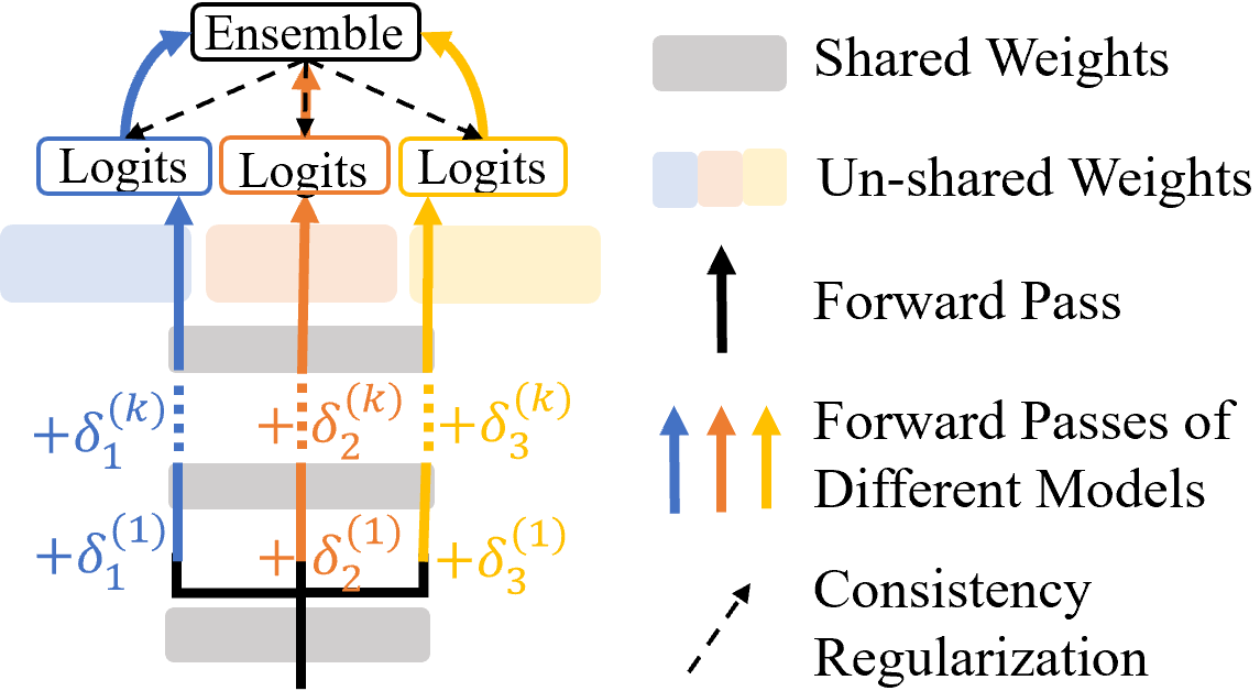 翻译:模型组合是一种流行的方法,可以产生一种低差异和广度的模型,然而,它却引起大量的记忆和推断成本,而这种成本往往无法为现实世界的部署所负担得起。现有的工作已经采用在模型之间分享权重的办法。但是,当提高共享权重的比例时,所产生的模型往往相似,使用模型组合减少的好处也相似。为了保留共同效益,同时保持低记忆成本,我们提议一种一致性和常规化的混合学习方法。具体地说,我们在所有模型中分享底层的重量,对不同模型的隐藏表示采用不同的扰动,这可以有效地促进模型的多样性。与此同时,我们采用一个预测一致性的固定化器,在受扰动的模型中控制因模型多样性而产生的差异。我们使用大语言模型的实验表明,CAMRO在保持低记忆成本的同时,大大改进了混合模型的通用性表现。具体地说,CAMERO在所有模型中比8个BER-80基准模型的标准型号要高得多。(GLUE,以0.7为基准,比GER-80M,比GLU。