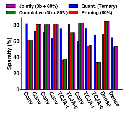 翻译:由于有可能开发能够实现生物大脑计算力和能源效率的人工系统,从而有可能开发能够实现生物大脑计算力和能源效率的人工系统,因此,高效地实施现代数字硬件系统也是机器学习和深神经网络的进步所激励的。在高效部署DNN(DVS)中广泛使用的两种技术 -- -- 量化和调整参数,既可以压缩模型大小,减少记忆足迹,也可以促进低纬度执行。四分化和修剪之间的相互作用,以及它们如何影响SNNN加速器的模型性能,目前尚不清楚。我们同时(同时)在分离、累积和(共同)的同时,将SNNNN的各种裁剪裁和四分化结合起来,以示对动态视觉传感器摄像头(DVSS)的姿态识别。我们显示,这种状态的模型既适合攻击性参数的四分化,又不会因精确度下降而导致四分权重力。然而,在模型中,精度的精确度只能维持45级的硬度结果。