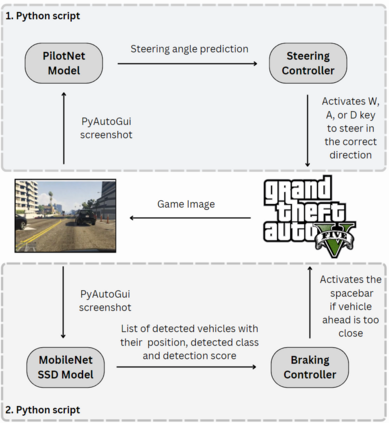 The technology of autonomous driving is currently attracting a great deal of interest in both research and industry. In this paper, we present a deep learning dual-model solution that uses two deep neural networks for combined braking and steering in autonomous vehicles. Steering control is achieved by applying the NVIDIA's PilotNet model to predict the steering wheel angle, while braking control relies on the use of MobileNet SSD. Both models rely on a single front-facing camera for image input. The MobileNet SSD model is suitable for devices with constrained resources, whereas PilotNet struggles to operate efficiently on smaller devices with limited resources. To make it suitable for such devices, we modified the PilotNet model using our own original network design and reduced the number of model parameters and its memory footprint by approximately 60%. The inference latency has also been reduced, making the model more suitable to operate on resource-constrained devices. The modified PilotNet model achieves similar loss and accuracy compared to the original PilotNet model. When evaluated in a simulated environment, both autonomous driving systems, one using the modified PilotNet model and the other using the original PilotNet model for steering, show similar levels of autonomous driving performance.
