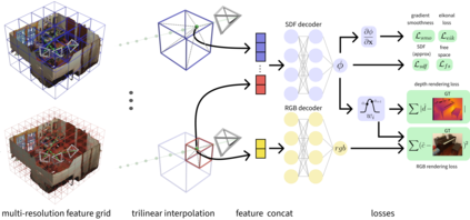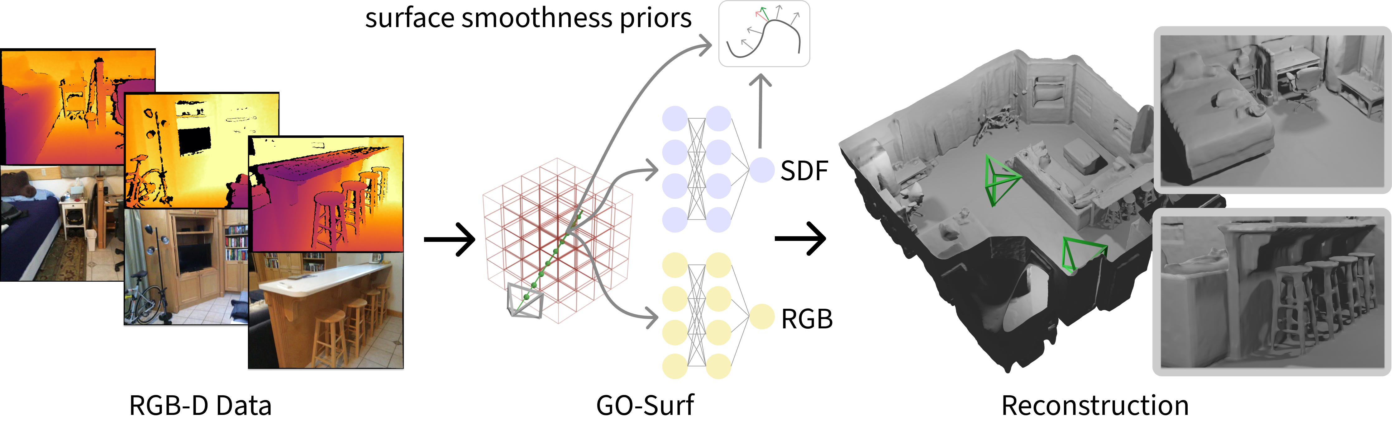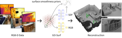 翻译:GO-Surf是使用RGB-D序列进行准确和快速地表重建的直接地格优化方法,我们从RGB-D序列中推出一种直接的地格优化方法,即GO-Surf。我们用一个包含多层次几何和外观信息的高级性格Voxel网格来模拟基础场景,其特性直接优化,这样,在三线内插后,由两个浅色MLP解码,以签署距离和亮度值,通过表面体积转换,使合成和观测RGB/深度值之间的差异最小化。我们的监督信号 -- -- RGB、深度和近似SDF -- -- 可以直接从输入图像中获取,而无需进行聚合或后处理。我们制定了一个新的SDF梯度定式术语,鼓励表面平滑和填补,同时保持高频细节。GO-Surf可以优化1美元-2K框架的顺序,以1美元至45分钟,加速度60美元超过NeurorRGBB-D,这是以MLP代表为基础的最相关方法,同时保持标准基准业绩。项目网页:http://jwangwangin_gusio.giubsurio/gisofgiofgio。
