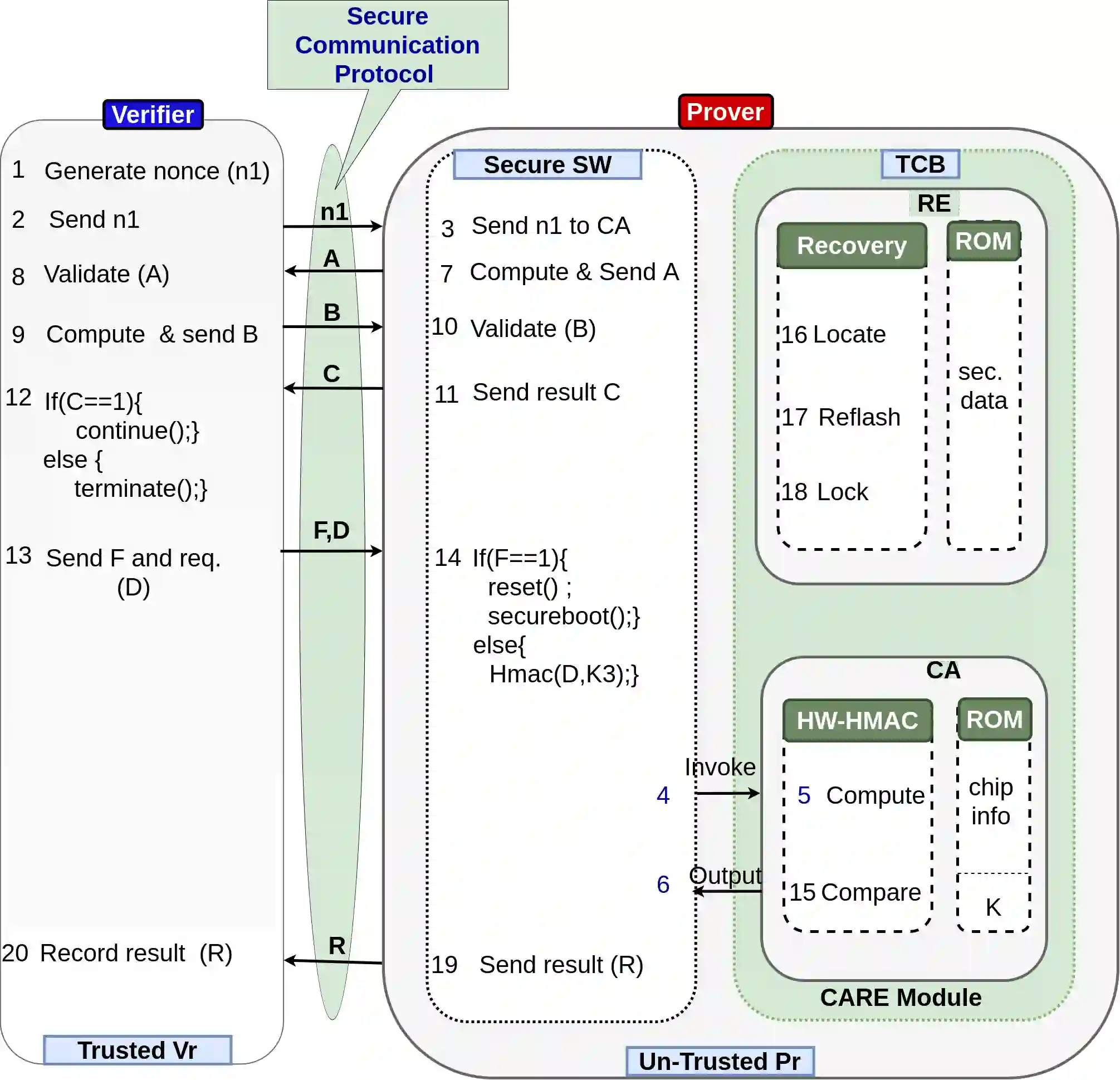 翻译:最近的技术进展使得大量使用小型嵌入式和IOT装置收集、处理和传输安全关键信息和用户数据成为了增加尖端攻击的催化剂,例如重播、中层人和恶意代码修改,以连接、泄漏、变节或利用安全关键信息进行恶意活动。因此,安全通信和软件状态保证(在运行和启动时)已成为公开的安全问题。此外,这些装置需要有一个适当的恢复机制,将它们带回已知的良好运行状态。以前的研究人员已经展示了独立的攻击探测和防护方法。然而,大多数研究人员缺乏在板上提供系统恢复和安全通信技术的功能。为了缩小这一差距,本稿建议SACARE(SACARE)-一个框架,利用定制光量、安全通信协议进行远程/当地验证,以及安全启动船上复原力恢复机制,以保护上述装置免受攻击。原型安装了高效的轻度、低功率32级的中继机探测和防护。
