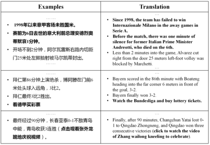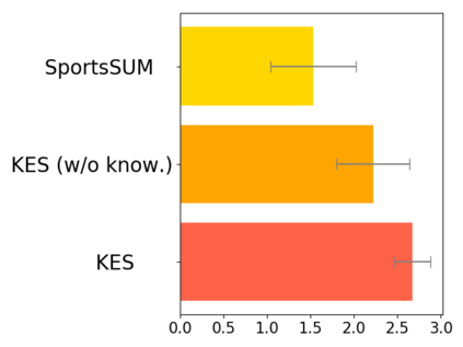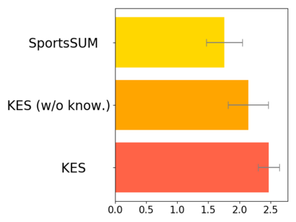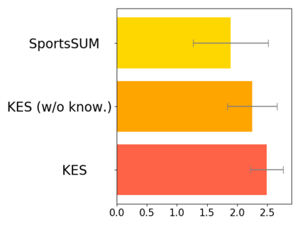 翻译:体育游戏总和旨在从现场评论中产生体育新闻。然而,现有的数据集都是通过自动收集和清理程序构建的,造成大量噪音。此外,目前的工作忽略了现场评论和体育新闻之间的知识差距,从而限制了体育游戏总和的性能。在本文中,我们引入了K-SportsSum,这是一个具有两个特点的新数据集:(1)K-SportsSum从大型游戏中收集了大量数据。它有7,854对评论-新闻。为了提高质量,K-SportsSum采用人工清理程序;(2)与现有的数据集不同,为了缩小知识差距,K-SportsSum进一步提供了包含523个体育队和14,724个体育运动员信息的大规模知识库。此外,我们还引入了一个利用现场评论和知识生成体育新闻的知识强化摘要。K-Sportsum和SportSum数据集的广泛实验显示,我们的模型实现了新的状态和艺术模型;(2)与现有数据集不同,以缩小知识差距,K-SportsSum进一步提供了包含523个体育队和14,724个体育运动员的信息。此外,我们还引入了知识强化的分析和人类研究。