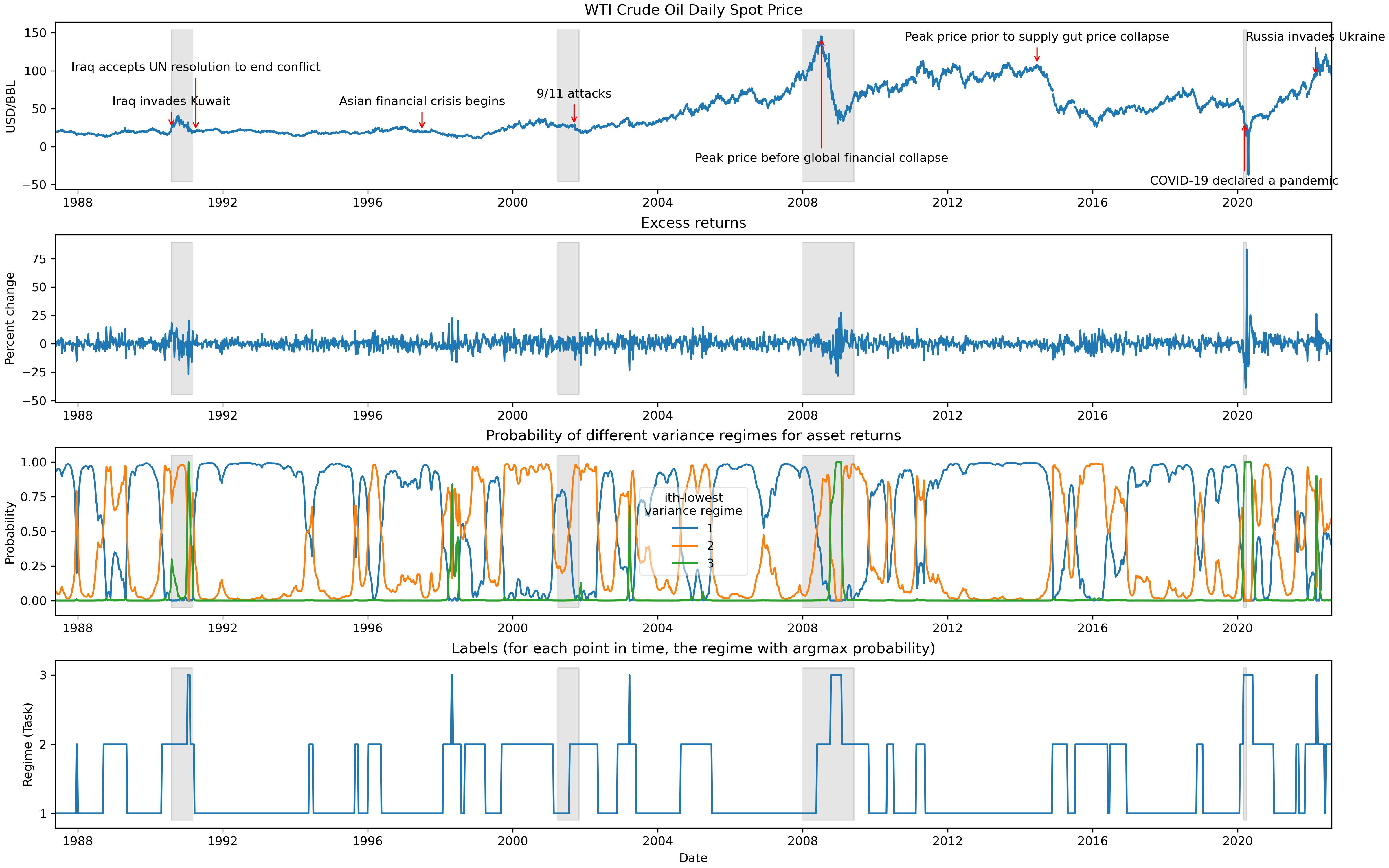 The scarcity of task-labeled time-series benchmarks in the financial domain hinders progress in continual learning. Addressing this deficit would foster innovation in this area. Therefore, we present COB, Crude Oil Benchmark datasets. COB includes 30 years of asset prices that exhibit significant distribution shifts and optimally generates corresponding task (i.e., regime) labels based on these distribution shifts for the three most important crude oils in the world. Our contributions include creating real-world benchmark datasets by transforming asset price data into volatility proxies, fitting models using expectation-maximization (EM), generating contextual task labels that align with real-world events, and providing these labels as well as the general algorithm to the public. We show that the inclusion of these task labels universally improves performance on four continual learning algorithms, some state-of-the-art, over multiple forecasting horizons. We hope these benchmarks accelerate research in handling distribution shifts in real-world data, especially due to the global importance of the assets considered. We've made the (1) raw price data, (2) task labels generated by our approach, (3) and code for our algorithm available at https://oilpricebenchmarks.github.io.
