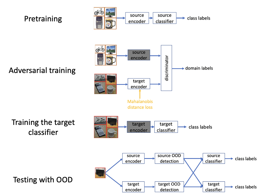 翻译:在智能计算中,特定任务训练样本的标签并不总是充足的。然而,相关但不同的数据集中样本的标签是可获得的。因此,研究人员依赖于无监督域自适应来利用一个数据集(源域)中的标签,以便在不同的、未标记的数据集(目标域)中进行更好的分类。现有的无生成对抗解决方案的UDA旨在通过对抗性训练实现领域混淆。理想情况下,完美的领域混淆是可以实现的,但不一定能够实现。为了在对抗性训练之上进一步强化领域混淆,我们提出了一种新的UDA算法E-ADDA,它既使用了一种新颖的马氏距离损失函数的变体,又使用了一种超出分布检测的子程序。马氏距离损失最小化编码目标样本和源域分布之间的分布距离,从而在对抗性训练之上强化附加的领域混淆。然后,OOD子程序进一步消除领域混淆失败的样本。我们在声学和计算机视觉模态方面进行了广泛全面的E-ADDA评估。在声学模态中,E-ADDA比多种最先进的UDA算法表现出最高29.8%的f1得分。在计算机视觉模态中,评估结果表明,我们在流行的UDA基准测试,如Office-31和Office-Home上实现了新的最先进性能,比次优表现算法表现高出了最高17.9%。