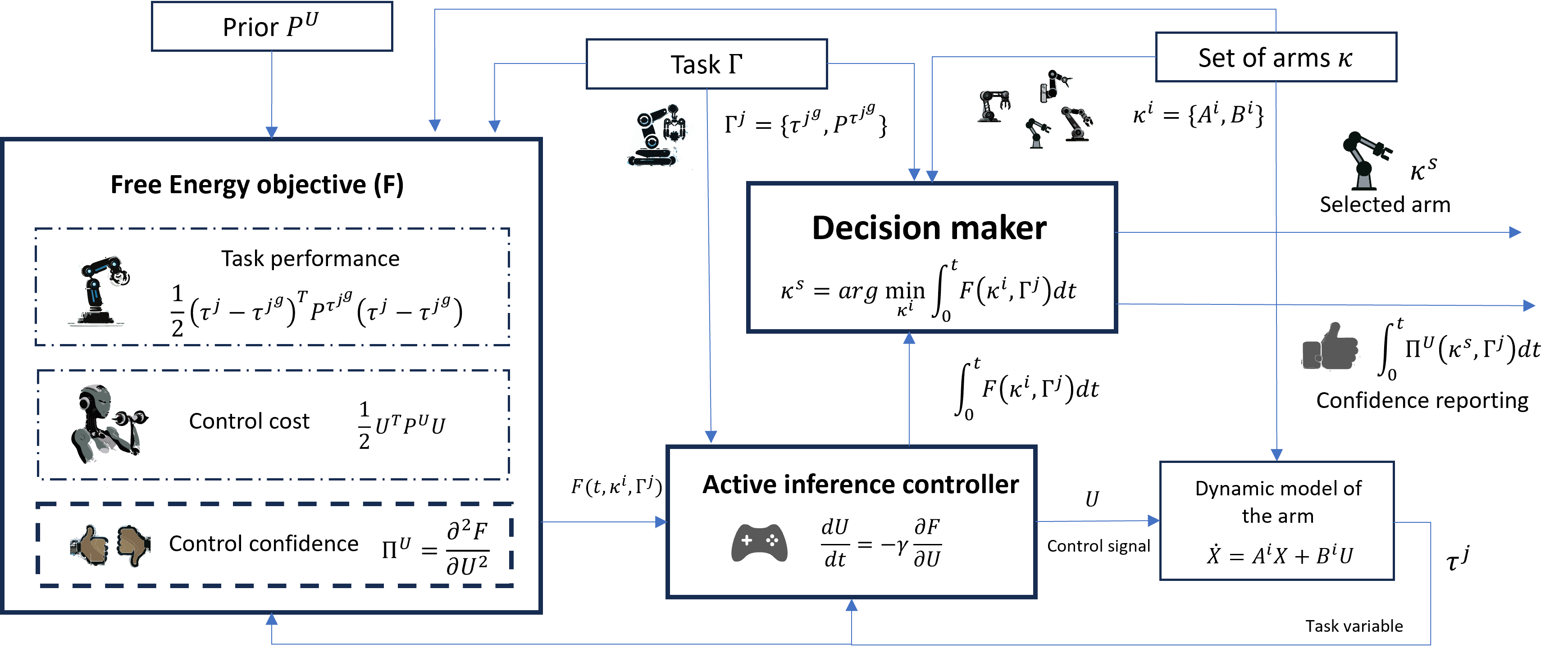 Self-reflecting about our performance (e.g., how confident we are) before doing a task is essential for decision making, such as selecting the most suitable tool or choosing the best route to drive. While this form of awareness -- thinking about our performance or metacognitive performance -- is well-known in humans, robots still lack this cognitive ability. This reflective monitoring can enhance their embodied decision power, robustness and safety. Here, we take a step in this direction by introducing a mathematical framework that allows robots to use their control self-confidence to make better-informed decisions. We derive a mathematical closed-form expression for control confidence for dynamic systems (i.e., the posterior inverse covariance of the control action). This control confidence seamlessly integrates within an objective function for decision making, that balances the: i) performance for task completion, ii) control effort, and iii) self-confidence. To evaluate our theoretical account, we framed the decision-making within the tool selection problem, where the agent has to select the best robot arm for a particular control task. The statistical analysis of the numerical simulations with randomized 2DOF arms shows that using control confidence during tool selection improves both real task performance, and the reliability of the tool for performance under unmodelled perturbations (e.g., external forces). Furthermore, our results indicate that control confidence is an early indicator of performance and thus, it can be used as a heuristic for making decisions when computation power is restricted or decision-making is intractable. Overall, we show the advantages of using confidence-aware decision-making and control scheme for dynamic systems.
