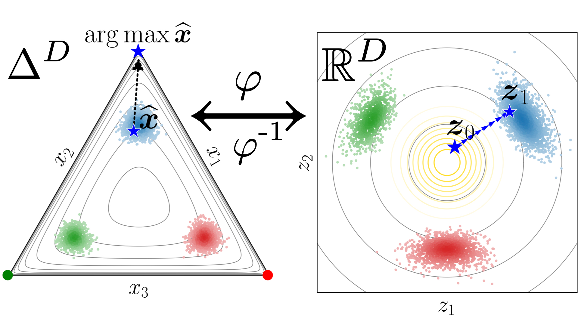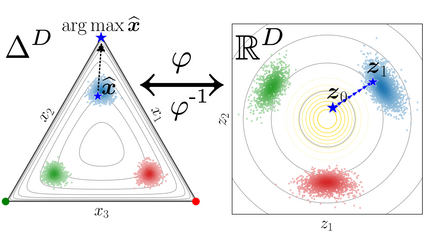 We propose a method for learning and sampling from probability distributions supported on the simplex. Our approach maps the open simplex to Euclidean space via smooth bijections, leveraging the Aitchison geometry to define the mappings, and supports modeling categorical data by a Dirichlet interpolation that dequantizes discrete observations into continuous ones. This enables density modeling in Euclidean space through the bijection while still allowing exact recovery of the original discrete distribution. Compared to previous methods that operate on the simplex using Riemannian geometry or custom noise processes, our approach works in Euclidean space while respecting the Aitchison geometry, and achieves competitive performance on both synthetic and real-world data sets.