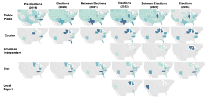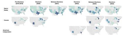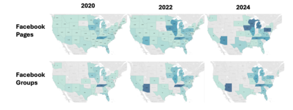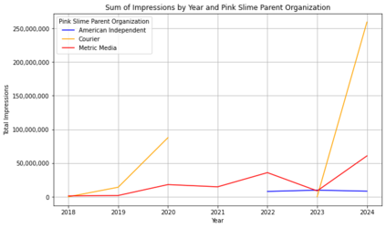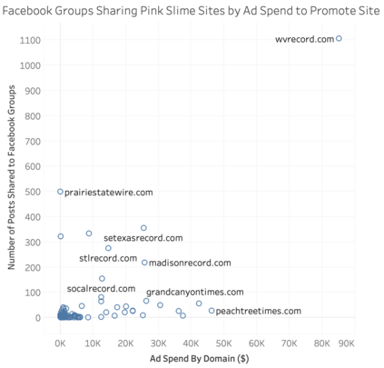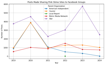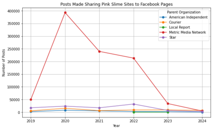 Pink slime journalism is a practice where news outlets publish low-quality or inflammatory partisan articles, claiming to be local news networks. This paper examines the spread of pink slime sites on Facebook using public posts from Pages and Groups. We evaluate the trends of sharing pink slime sites on Facebook and patterns regarding the advertisements purchased by the parent organizations of the pink slime news networks. Our analysis discovers that while the number of pink slime posts on Facebook pages have decreased over the years, advertising dollars have increased. The increase in advertising dollars influences an increase in Facebook group posts. Further, the advertising expenditure increases during election years, but contentious topics are still discussed during non-election years. By illustrating the patterns and themes from US election years of 2020, 2022, and 2024, this research offers insights into potentially dangerous journalism tactics, and provides predictions for future US Presidential Elections.