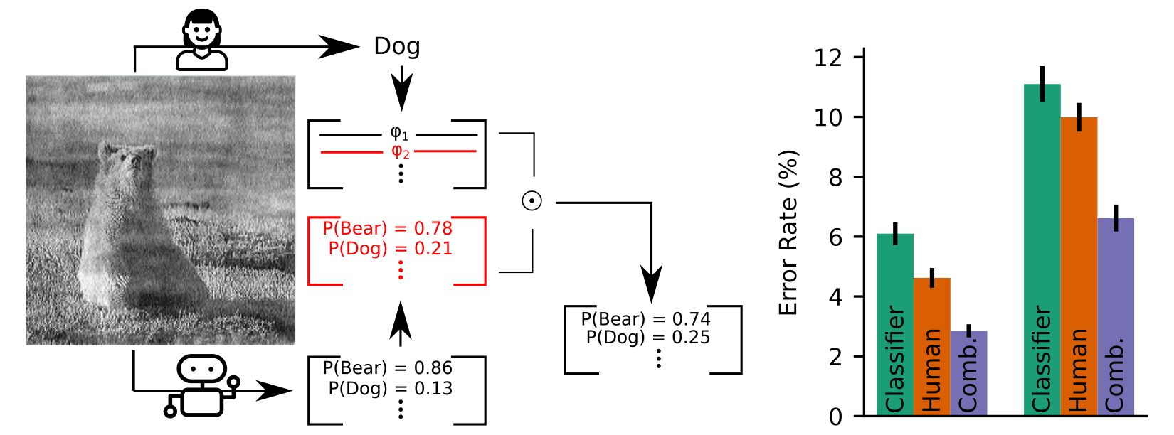 翻译:机器学习模型日益常用的一个案例是提高人类决策者的能力。对于人类或模型都不完全准确的分类任务,获得高性能的一个关键步骤是以利用其相对优势的方式结合个人预测。在这项工作中,我们开发了一套算法,将模型的概率输出与人类的等级输出结合起来。我们从理论上表明,我们的组合模型的准确性不仅取决于个人和模型的精度,而且也取决于模型的自信。关于图像分类的经验性结果与CIFAR-10和图像网络的一个子集表明,这种人类模型组合始终具有比模型或人类本身更高的灵巧性,而且组合方法的参数可以有效估计,只有10个标记的数据点。