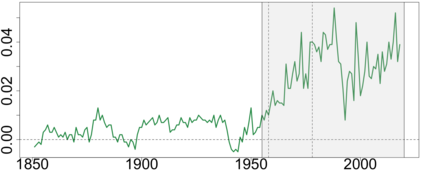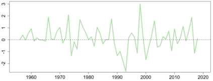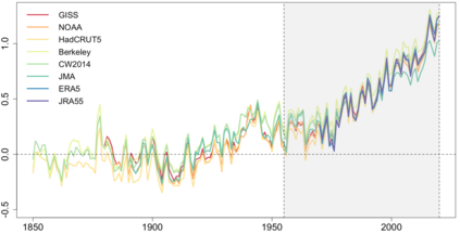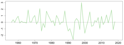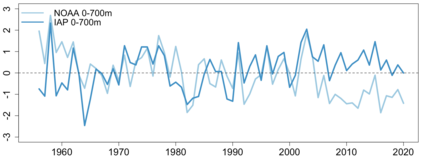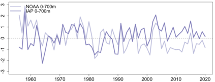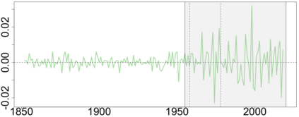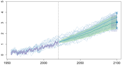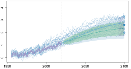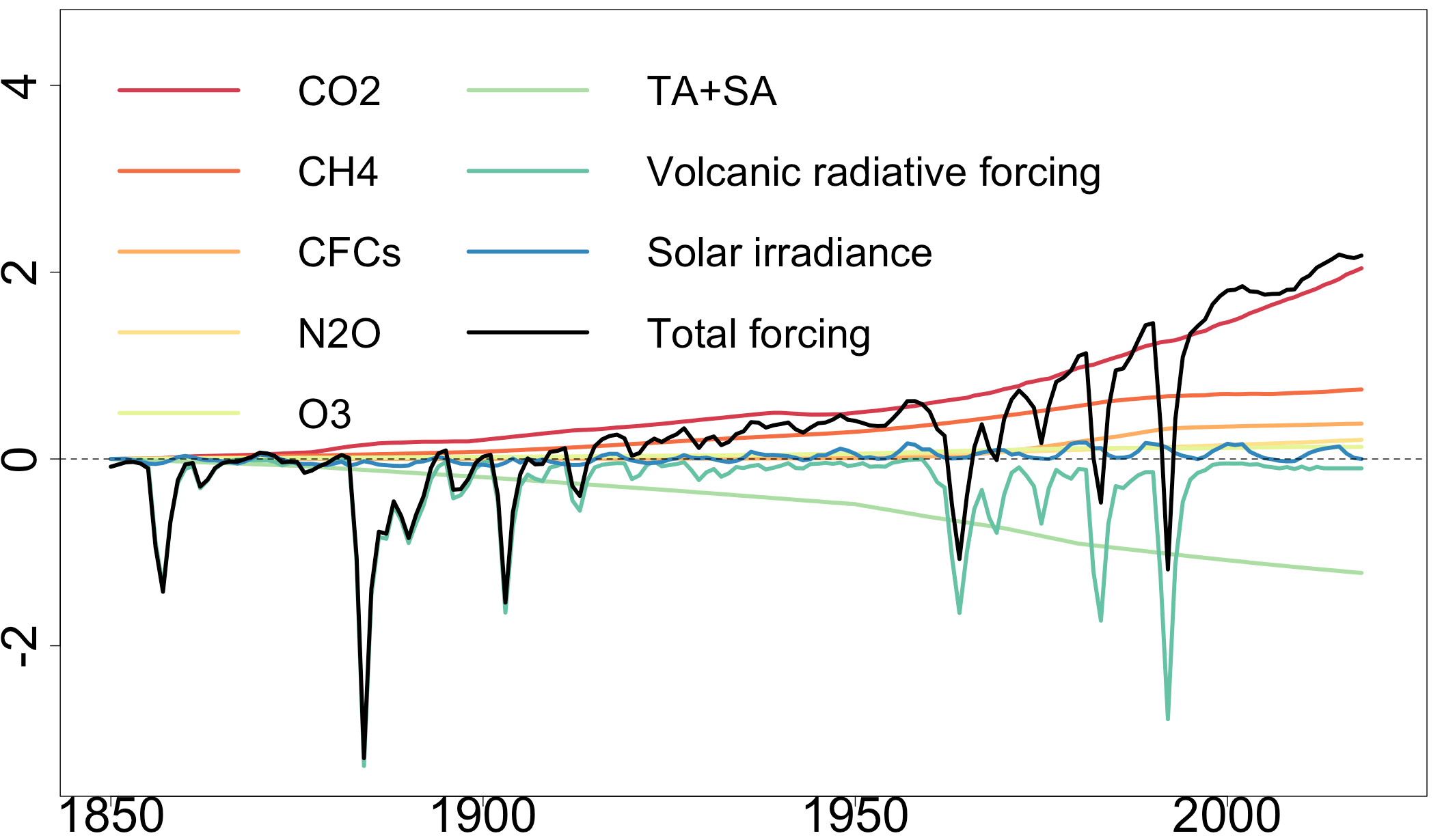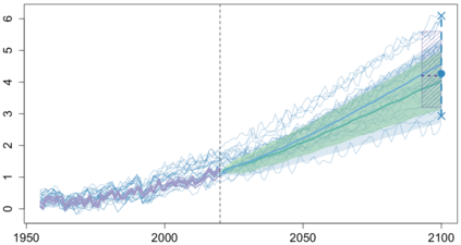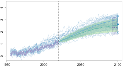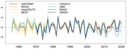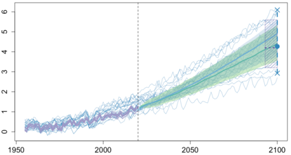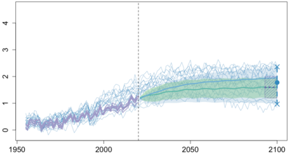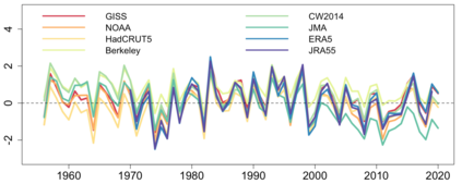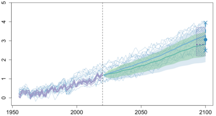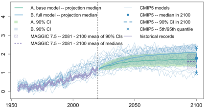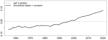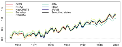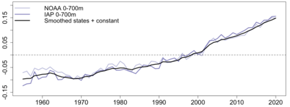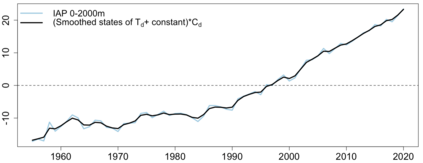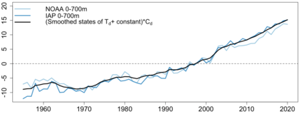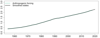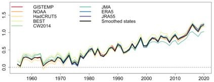 翻译:本文利用历史数据估算了作为线性状态空间系统(EBM-SS模型)的两部分能源平衡模型(EBM-SS模型),这是混合层温度、深海层温度和辐射力的联合模型。EBM-SS模型允许模拟非常态强迫、为潜在过程纳入多种数据源以及处理缺失的观测。我们用最大可能性估算了1955-2020年全球水平观测数据集的EBM-SS模型。我们在实验估计和模拟中显示,利用多种数据源进行潜伏过程会减少参数估计的不确定性。当EBM-SS模型与8个全球观测平均地表温度(GMST)异常系列相匹配时,物理参数估计数和根据代表集中路径(RCP)设想的GMST预测可与组合模型5(CMIP5)模型和温室气体诱导气候变化评估气候模拟模型(MAGICC)的预测相比较。这提供了仅使用简单的气候模型和历史记录即可产生有意义的GMST预测的证据。