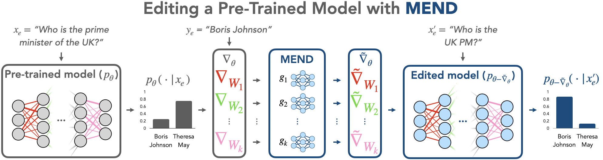 翻译:尽管经过事先培训的大型模型使得在各种下游任务上取得了令人印象深刻的结果,但最大的现有模型仍然会出错,甚至准确的预测可能随着时间的推移而过时。由于不可能在培训时间发现所有这些失败,因此不可能在培训时间发现所有这些失败,使这些模型的开发者和终端用户能够纠正不准确的产出,而使模型保持原样,这是可取的。然而,大型神经网络所学的演示的分布式黑箱性质使得难以产生这种有针对性的编辑。如果只用单一的有问题的投入和新的预期产出来显示,微调方法往往会过度适用;其他编辑算法要么计算不可行,要么在应用非常大的模型时效果不明显。为了便于在规模上进行容易的后热编辑,我们建议模型的模型网型(MEND)和终端编辑网(MEND)能够使用单一所需的投入-输出配对来快速进行本地编辑。 MEND学会只学会改变通过标准微调获得的梯度模型取得的梯度,使用10亿分级的梯度的梯度的梯度,甚至使这一变形模型的参数化。MEND在10亿个经过训练的模型上进行快速的GPL的测试。