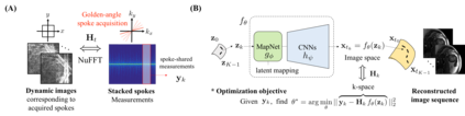 翻译:我们建议为动态磁共振成像(MRI)重建开发一种新型的未经监督的深层学习算法。动态磁共振成像(MRI)要求为研究心脏等移动器官而快速获取数据。现有的重建方法在模型设计或地面真象数据缺失的情况下受到限制,导致图像质量低。我们引入了深图像前导法的通用版本,优化网络重量以适应一连串稀有获得的动态磁共振成像测量。我们的方法不需要事先培训或额外数据。特别是心脏图像,不需要心跳图的标记或对话筒重新排序。我们方法的关键成份有三重:1)固定的低维元,能将图像的时间变化编码起来;2)将元图绘制成一个更清晰的潜藏空间的网络;3)进动神经网络,根据潜伏变量生成一系列磁共振成动态的磁共振成图像,并且有利于与K空间测量的一致性。我们的方法超越了对心电图的标记或重新排序。我们的方法的关键成了状态的状态方法。我们的方法有三重:1,一个固定的低维的维维维的元元的元元元模型和直压数据是不断的不断的不断的不断的再演进进式数据。