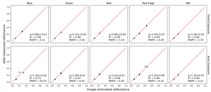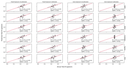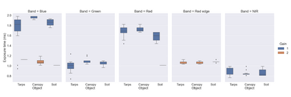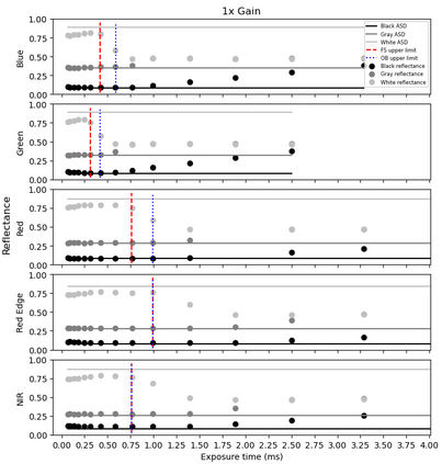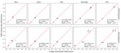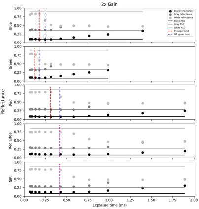 Radiometric accuracy of data is crucial in quantitative precision agriculture, to produce reliable and repeatable data for modeling and decision making. The effect of exposure time and gain settings on the radiometric accuracy of multispectral images was not explored enough. The goal of this study was to determine if having a fixed exposure (FE) time during image acquisition improved radiometric accuracy of images, compared to the default auto-exposure (AE) settings. This involved quantifying the errors from auto-exposure and determining ideal exposure values within which radiometric mean absolute percentage error (MAPE) were minimal (< 5%). The results showed that FE orthomosaic was closer to ground-truth (higher R2 and lower MAPE) than AE orthomosaic. An ideal exposure range was determined for capturing canopy and soil objects, without loss of information from under-exposure or saturation from over-exposure. A simulation of errors from AE showed that MAPE < 5% for the blue, green, red, and NIR bands and < 7% for the red edge band for exposure settings within the determined ideal ranges and increased exponentially beyond the ideal exposure upper limit. Further, prediction of total plant nitrogen uptake (g/plant) using vegetation indices (VIs) from two different growing seasons were closer to the ground truth (mostly, R2 > 0.40, and MAPE = 12 to 14%, p < 0.05) when FE was used, compared to the prediction from AE images (mostly, R2 < 0.13, MAPE = 15 to 18%, p >= 0.05).