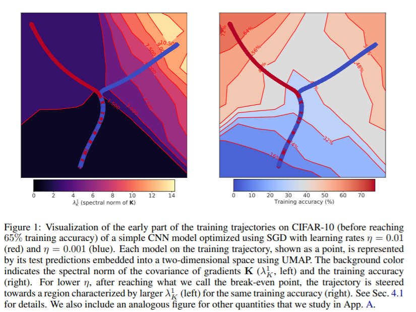 深度神经网络的早期训练对其最终性能至关重要。在这项工作中,我们研究了在训练初期使用的随机梯度下降(SGD)超参数如何影响优化轨迹的其余部分。我们认为在这条轨迹上存在“盈亏平衡点”,超过这个平衡点,损失曲面的曲率和梯度中的噪声将被SGD隐式地正则化。特别是在多个分类任务中,我们证明了在训练的初始阶段使用较大的学习率可以减少梯度的方差,改善梯度的协方差条件。从优化的角度来看,这些效果是有益的,并且在盈亏平衡点之后变得明显。补充之前的工作,我们还表明,使用低的学习率,即使对于具有批处理归一化层的神经网络,也会导致损失曲面的不良适应。简而言之,我们的工作表明,在训练的早期阶段,损失表面的关键属性受到SGD的强烈影响。我们认为,研究确定的效应对泛化的影响是一个有前途的未来研究方向。
