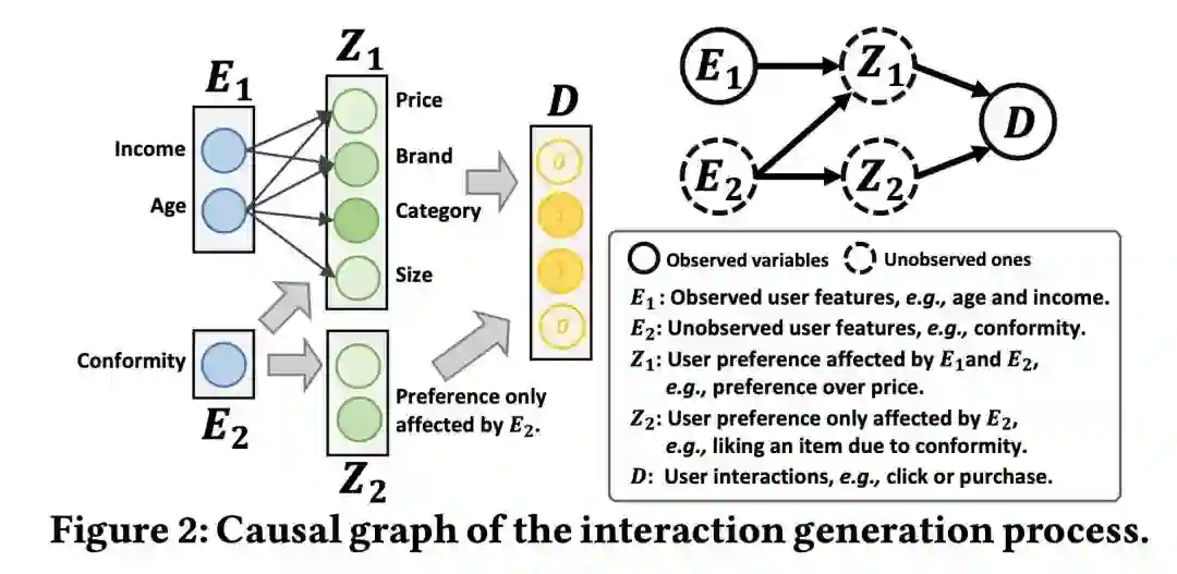 对于每个用户,用户的偏好同时受可观测的特征(例如收入和年龄),和不可观测的特征例如心理状态的影响。仅受不可观测特征的影响,而受所有特征的影响。用户偏好会影响最终的交互结果。 将和分别定义为用户索引和产品索引,为用户偏好,交互为,用户特征从到的转移表示为干预 ,OOD推荐系统的任务即为推断出经过干预后用户交互的分布,具体分为两个任务:第一是在只能够获取到用户特征变化前的历史交互信息的情况下,为特征变化后的用户推荐合适的产品;第二是当用户特征变化后的交互能被获取时,推荐系统具有快速适应到OOD环境的能力。