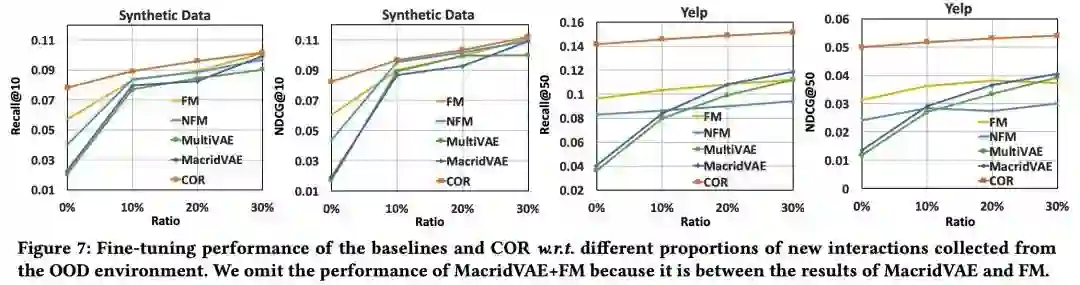 而对于第二个OOD推荐任务的目标即快速适应能力,作者也在不同数据集上进行了验证,如图所示: image-20220510013141360 通过对比在用户特征发生变化后的OOD环境下,分别对没有最新交互信息(0%),和10%,20%以及30%的最新交互信息微调在IID上预训练好的模型。实验结果验证COR框架能够让模型拥有很快的OOD适应能力