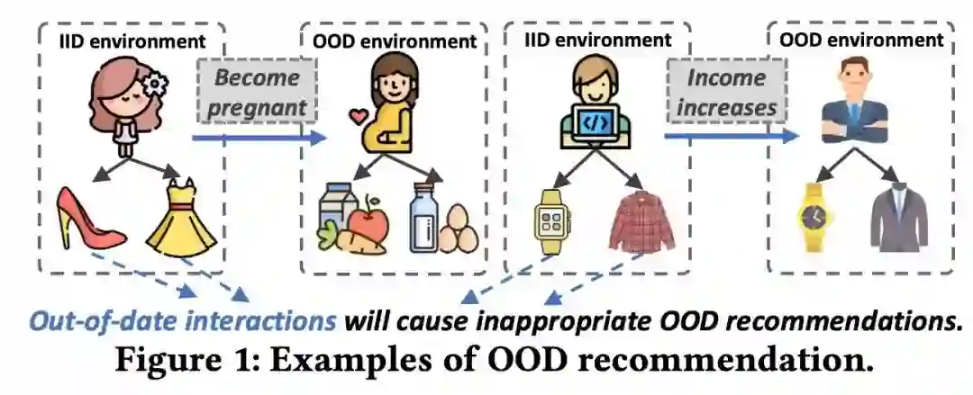 现代推荐系统从历史交互中学习用户表征,这就存在着用户特征变化带来的问题,比如收入的增加。历史交互会将过时的信息注入到与最新的用户特征相冲突的表示中,从而导致不恰当的推荐。在这项工作中,作者考虑了在用户特征发生变化的Out-Of-Distribution (OOD) 环境中的推荐问题,并为表征学习设定了额外的两个目标:强大的OOD泛化能力以及快速的OOD适应能力。OOD场景的推荐问题如图所示: