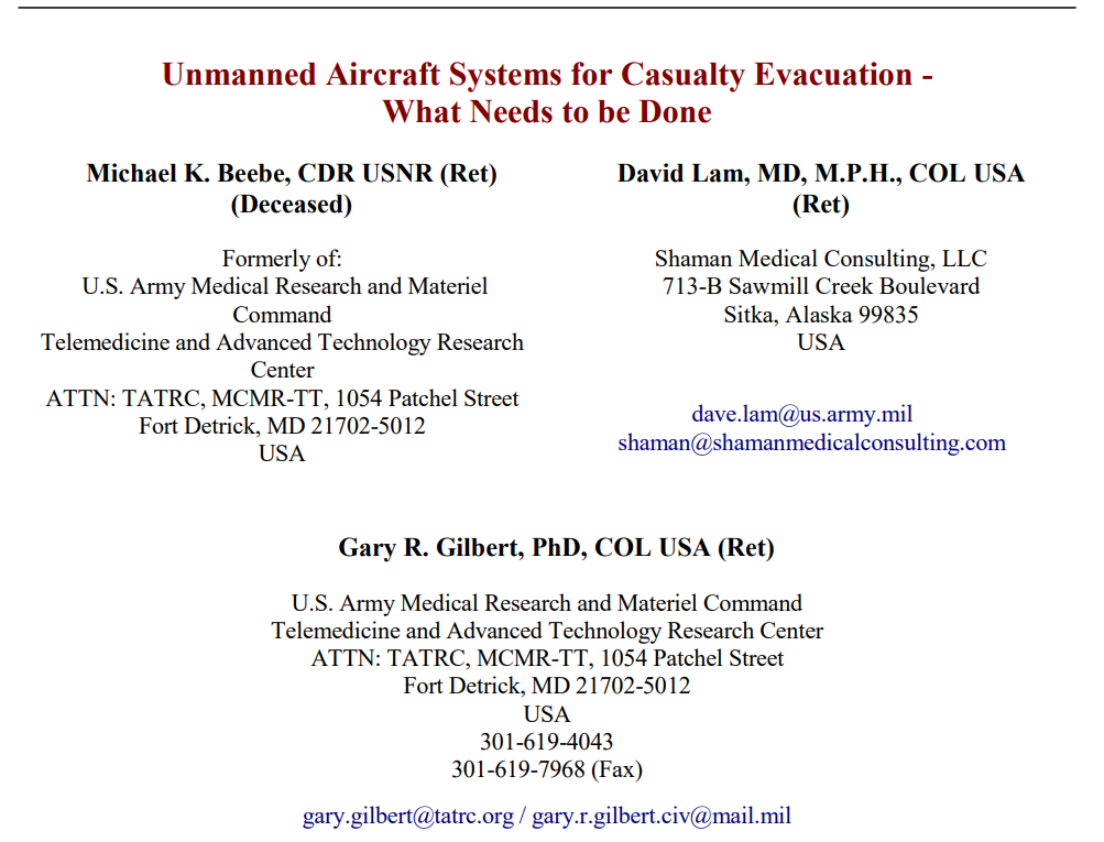 理由:空中后送已成为伤员后送的标准。飞机的飞行参数由飞行员控制,因此通常在伤员的承受范围之内。然而,目前还没有一套国际公认的伤员可容忍生理标准或辅助数据。二战结束后一直在使用的直升机运送伤员可能会也可能不会造成额外伤害--无论哪种情况都没有可量化的数据。这一点是 VTOL 无人机系统用于 CASEVAC 时需要关注的问题,因为某些无人机系统可能会造成超过目前大多数撤离飞机的生理压力。如果要使用无人机系统执行 CASEVAC 任务,有必要商定一套生理参数。虽然 CASEVAC 通常是一项临时性的、即来即用的任务,但为了谨慎起见,应告知 VTOL 无人机系统制造商和作战指挥官在无人机系统可能搭载伤员的情况下应考虑的具体医疗问题或要求。