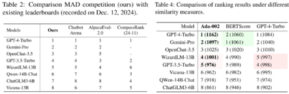 对于每个选定指令及其配对输出,人类评估者执行三选一强制选择任务,结果记为: 第t次比较的Elo分数更新: 其中η和τ为缩放参数。我们采用bootstrap技术以减轻线性更新方法对比较顺序的敏感性。 纳入新LLM:将新LLM(即)纳入MAD竞争非常简单且成本效益高。无需修改现有采样指令集和MAD响应集。只需采样新的条指令以最大化与现有模型集的差异,收集人类偏好,并使用Elo公式更新全局排名。 三、实验分析