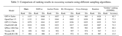我们将MAD竞争采样算法与五种基线进行比较:1) DiffUse采样框架,2) Anchor Points方法,3) KL散度,4) 基于交叉熵的采样算法,以及5) 随机采样。结果如表3所示。 由于KL散度和交叉熵依赖于令牌对数概率,它们不适用于某些基于API的模型(如Gemini-Pro)。因此,我们在推理场景中评估了七个兼容所有采样方法的LLM。我们的指令池源自GSM8K数据集,指导人类标注者将推理准确性作为关键评估标准。GSM8K测试集上的模型准确率作为"黄金"排名。 值得注意的是,MAD竞争策略仅使用K=10个选定样本就能近似黄金排名,相比原始测试集的8K样本。而其他基线策略的排名显示不一致性。例如,KL散度将GPT-4-Turbo排在前列之后,而交叉熵将ChatGLM3-6B排在GPT-4-Turbo和GPT-3.5-Turbo之前。 我们还定性分析了四种策略在指令选择上的差异。结果表明,KL散度策略选择的指令几乎都与诗歌相关(10个中有9个),交叉熵策略偏好写论文和故事等任务,随机策略经常引入重叠的任务类型。而MAD竞争策略优先考虑指令多样性,最大限度减少所选指令中重复任务类型的出现,有助于在更广泛的任务中暴露LLM的缺陷。