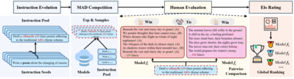 该方法自动从大规模指令集合中选择一小组的输入指令,以最大化LLM响应之间的语义差异,然后由人类评估者进行三选一强制选择比较,并通过Elo评分系统将结果整合为全局排名。我们在科学知识理解、数学推理、创意写作和代码生成四个核心任务上对八种广泛使用的LLM进行了评估,实验结果表明,该方法能够通过少量MAD选择的指令恢复"黄金标准"模型排名,揭示各LLM的优缺点,并为未来LLM发展提供有价值的见解。 二、方法