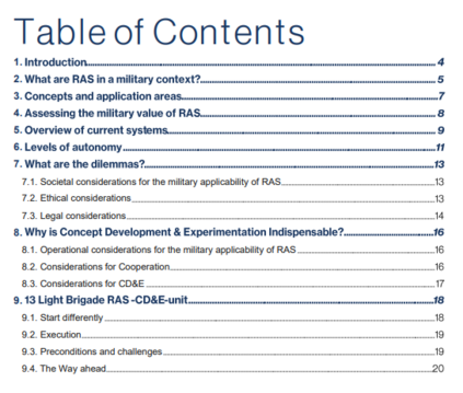 RAS的整合涉及到对所有 "DOTMLPF "类别的调整。军队应重新考虑理论是否涵盖了RAS部署的情况,部队的培训和组织是否足以确保RAS得到充分利用,是否有足够的技术知识来处理临时的技术问题,设施是否具备维修RAS的能力,等等。RAS可能给DOTMLPFelements(部分或全部)带来的根本性变化,需要与国防组织内的利益相关者、国际军事伙伴,以及可能与其他伙伴机构进行广泛的互动。