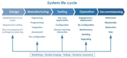 生命周期。生命周期的概念包括系统的各个阶段,从设计到制造、测试、运行中的使用和退役。每个阶段的责任以及自动化系统的各个方面都有所不同。总而言之,在法律和道德范围内,自动化(军事和或双重用途)组件的生命周期得到良好管理的总体责任在于订购系统的国防组织。在这样做的时候,其采购规格应包含这些内容。各个(子)系统的生产商要对其部件的运作负责。