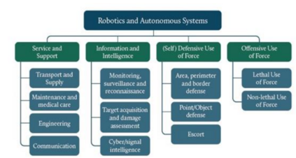 "杀手机器人 "的言论使公众对军事背景下的机器人和自主系统的看法变得狭隘,只认为是高度或完全自主的系统对武力的致命使用。实际上,RAS可以应用于许多军事功能和任务,每种功能都有不同程度的自主性(见图1)。机器人和自主系统的广泛军事适用性产生了许多巨大的机会。未来几年的挑战是如何充分利用这些机会,发挥军事优势的潜力,同时减轻所带来的风险。