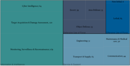 使用HCSS的军事功能分类法,对当前的RAS进行了事实性的概述(见图1)。本节将首先展示该分类法的第一层;然后是第二层,对RAS的潜在军事应用进行更详细的说明。为了提供一个清晰的关于RAS生产和使用的广泛观点,可视化将显示每个国家生产/使用的项目的大致数量。
