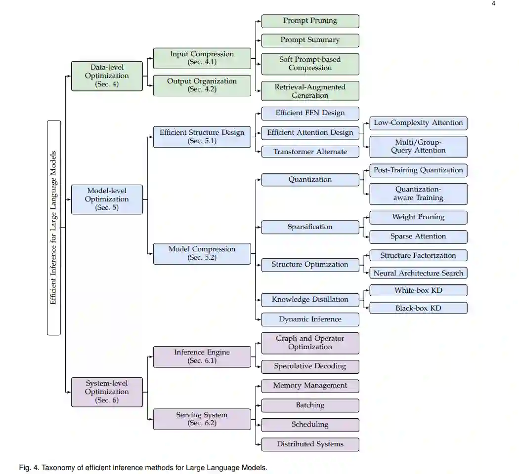在上述讨论中,我们确定了三个关键因素(即计算成本、内存访问成本和内存使用),这些因素在LLM推理过程中显著影响效率,并进一步分析了三个根本原因(即模型大小、注意力操作和解码方法)。已经做出了许多努力,从不同的角度优化推理效率。通过仔细回顾和总结这些研究,我们将它们分类为三个层次,即数据级优化、模型级优化和系统级优化(如图4所示):