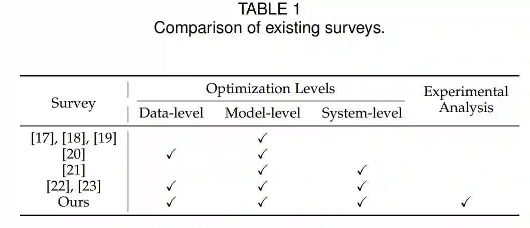 幸运的是,已经提出了大量技术以实现LLMs的高效推理。为了全面理解现有研究并激发进一步的研究,本综述采用了层次分类和系统总结的方法来描述高效LLM推理的当前景观。具体来说,我们将相关研究分为三个层次:数据级优化、模型级优化和系统级优化(详见第3节)。此外,我们对代表性方法进行了实验分析。目前,已经进行了几项综述 [17],[18],[19],[20],[21],[22],主要关注LLMs效率的不同方面,但仍提供了进一步改进的机会。朱等人 [17],朴等人 [18] 和王等人 [19] 关注于模型级优化中的模型压缩技术。丁等人 [20] 聚焦于考虑数据和模型架构的效率研究。苗等人 [21] 从机器学习系统(MLSys)研究的角度探讨高效LLM推理。与之相比,我们的综述提供了更全面的研究范围,涵盖了数据级、模型级和系统级的优化,并包括了最新的进展。尽管万等人 [22] 和徐等人 [23] 也提供了高效LLM研究的全面综述,我们的工作通过结合比较实验,并根据在几个关键子领域如模型量化和服务系统的实验分析提供实用的见解和建议,进一步扩展了这些工作。这些综述的比较总结在表1中。