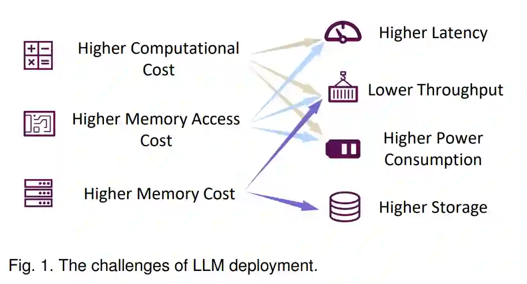 近年来,大型语言模型(LLMs)已经从学术界和工业界获得了大量关注。LLMs领域经历了显著的增长和重大成就。众多开源的LLMs已经出现,包括GPT系列(GPT-1 [1],GPT-2 [2],和GPT-3 [3]),OPT [4],LLaMA系列(LLaMA [5],LLaMA 2 [5],百川2 [6],Vicuna [7],长聊 [8]),BLOOM [9],FALCON [10],GLM [11],和Mistral [12],这些模型被用于学术研究和商业目的。LLMs的成功源于它们在处理各种任务(如神经语言理解(NLU),神经语言生成(NLG),推理 [13],[14] 和代码生成 [15])中的强大能力,从而使得如ChatGPT、Copilot和Bing等应用产生了重大影响。人们日益相信 [16],LLMs的崛起和成就标志着人类向人工通用智能(AGI)的重大步伐。然而,LLMs的部署并不总是顺利进行。如图1所示,LLMs在推理过程中通常需要更高的计算成本、内存访问成本和内存使用率(我们将在第2.3节分析根本原因),这降低了资源受限场景中的效率指标(例如,延迟、吞吐量、能耗和存储)。这为LLMs在边缘和云场景中的应用带来了挑战。例如,巨大的存储需求使得在个人笔记本电脑上部署一个700亿参数的模型用于开发辅助任务变得不切实际。此外,如果LLMs被用于每一个搜索引擎请求,低吞吐量将导致显著的成本,从而大幅降低搜索引擎的利润。