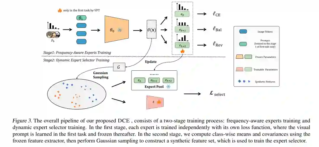 领域增量学习(Domain-Incremental Learning,DIL)旨在应对非平稳环境中的持续学习问题,要求模型能够适应不断变化的领域,同时保留已有的历史知识。在面对不平衡数据时,DIL 面临两个关键挑战:域内类别不平衡和跨域类别分布转移。这些挑战严重阻碍了模型性能的发挥:域内不平衡会导致少样本类别的欠拟合,而跨域分布转移则要求模型在保持多样本类别知识的基础上,提升旧领域中少样本类别的表现。 为解决上述问题,本文提出了双重平衡协同专家(Dual-Balance Collaborative Experts, DCE)框架。DCE 引入了一个频率感知的专家组,每个专家通过特定的损失函数进行引导,学习对应频率组的特征,从而有效应对域内类别不平衡问题。随后,DCE 通过对历史类别统计信息进行平衡高斯采样,合成伪特征,从而学习一个动态专家选择器。该机制在“保留旧领域中多样本类别知识”与“利用新数据提升旧任务中少样本类别性能”之间实现了有效权衡。 在四个基准数据集上的广泛实验结果表明,DCE 在不平衡领域增量学习任务中达到了当前最先进的性能水平。
