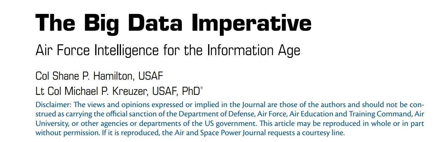 大数据是当今媒体和政府讨论的主题。当大数据与人工智能相结合时,它被描述为一个 "简易按钮",可以减少人类的分析负担。一些人认为这是对秩序的潜在威胁,而另一些人则认为这是在大肆炒作,却鲜有惊天动地的成果。什么是大数据,为什么它对情报界(IC)和联合军事行动的未来至关重要?