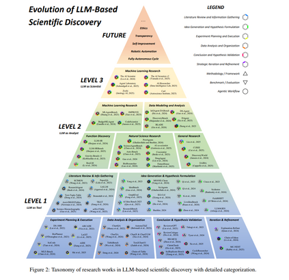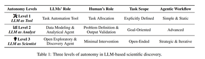 本文聚焦于LLM系统在科学发现中的应用,特别是其不同层级的自主性。虽然我们承认LLM在科学中的广泛影响,但本文有意缩小研究范围,不涵盖通用科学LLM或面向特定领域的知识获取与推理模型——这类内容已在现有综述中有较充分的探讨(Zhang 等,2024, 2025)。本文其余部分结构如下:第2节介绍我们的分类框架及其与科学方法的对应关系;第3节分析“工具型LLM”的应用,按科学方法各阶段分类;第4节探讨“分析者型LLM”的应用,按科学领域划分;第5节聚焦于“科学家型LLM”的研究,分析其创意生成与优化机制;第6节讨论未来面临的挑战与发展方向。