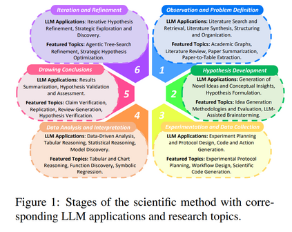 大型语言模型(LLMs)的持续进步催生出一系列新兴能力,如规划(Huang 等,2024b)、复杂推理(Huang 和 Chang,2023)以及指令遵循(Qin 等,2024)。此外,将代理型工作流(agentic workflows)整合进来,使得基于LLM的系统能够执行更高级的功能,包括网页导航(He 等,2024)、工具使用(Qu 等,2025)、代码执行(Jiang 等,2024a)和数据分析(Sun 等,2024)。在科学发现领域,这种高级LLM能力与代理机制的融合正推动一场深刻的范式转变。该转变不仅有望加速科研生命周期,还将从根本上改变人类研究者与人工智能在知识探索中的协作关系。 然而,LLM应用的迅猛扩展及其在科学发现中所引发的范式变化,也带来了诸多挑战。LLM演化速度之快,以及其与复杂科研流程的深度融合,使得系统性的评估愈发困难,因此亟需结构化的概念框架来整理当前认知,并指引未来发展方向。尽管现有综述已对LLM在多个科学领域的应用进行了有价值的概览(Zhang 等,2024, 2025),或对科学中的特定AI技术进行了分类(Luo 等,2025;Reddy 和 Shojaee,2025),但它们往往聚焦于特定学科的应用,或仅呈现LLM能力的静态快照。因此,这些综述可能忽略了LLM自主性不断增强的关键趋势,以及其在整个科学方法流程中角色的动态演变,从而未能充分揭示其影响力的广度与未来向更高独立性演进的潜力。 为系统描绘这一演进图景,并弥补上述空白,本文的分析框架以经典科学方法的六个阶段(见图1)为基础(Popper,1935;Kuhn,1962):(1)观察与问题定义,(2)假设提出,(3)实验与数据收集,(4)数据分析与解释,(5)得出结论,(6)迭代与优化。我们对LLM在这些阶段中的应用进行分析,发现一个显著趋势:LLM正从在单一阶段执行离散的、面向任务的功能,逐步发展为能贯穿多个阶段的复杂代理型系统。值得注意的是,最新研究(Schmidgall 等,2025;Yamada 等,2025)正在探索几乎能够自主完成整个科学流程的LLM系统。 为了更有效地捕捉与描述LLM能力与独立性日益增强的演化路径,本文提出一个基础性的三层级分类框架(见表1),用于定义LLM在科学发现中的不同角色:(i)工具型LLM(LLM as Tool):模型在直接监督下完成具体、明确的任务,辅助人类研究者;(ii)分析者型LLM(LLM as Analyst):模型具备更高的自主性,能够处理复杂信息、执行分析并提供洞见,减少人工干预;(iii)科学家型LLM(LLM as Scientist):代表更高级阶段的系统,能够自主执行从假设构建到结果解释及提出后续研究方向等主要科研流程。 在此分类体系基础上,我们进一步识别出当前研究格局中的关键空白,并提出未来发展的核心挑战与方向,包括:(1)实现无需人工干预的全自主科学发现流程;(2)将机器人自动化引入实验室,实现物理世界的交互与操作;(3)基于以往研究经验实现持续的自我改进与适应;(4)提升LLM主导科研的透明度与可解释性;(5)建立符合伦理与社会价值的治理机制。解决上述多维挑战,将是实现AI作为科学探索变革性合作伙伴的关键。