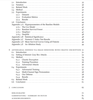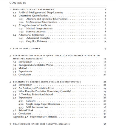 **本文共分为4个独立章节,分别研究面向医学图像分割与重建的不确定性量化方法、面向生存分析的鲁棒深度模型和新的灰盒对抗防御算法。**该论文结合了理论和实证结果,包含了医疗健康中的两个应用,即医学图像分析和生存分析。**在第3章和Hu et al.[54]中,提出了一种新的医学图像分割的监督不确定性量化方法。利用多级标注的可变性作为"基础真相"偶然不确定性的来源,并将其视为监督学习问题中的目标。**我们将这种基本事实的不确定性与概率U-Net[69]相结合,并在LIDC-IDRI肺结节CT数据集[5,6,20]和MICCAI2012前列腺MRI数据集[82]上进行测试。我们发现,我们能够改进预测的不确定性估计。我们还发现可以提高样本精度和样本多样性。**在第4章和Hu、Pezzotti和Welling[53]中,我们提出了一种新方法,可以准确评估医学图像重建模型的预测精度。**首先,通过将预测误差分解为随机误差和系统误差,证明当前方法估计的预测不确定性与预测误差不高度相关,并表明前者等价于随机误差的方差。目前的方法通过修改模型结构和训练损失来联合估计真实目标和数据的不确定性,从而不必要地损害了性能。分别估计它们而不进行修改可以提高性能。接下来,建议分两步估计目标标签和预测误差的大小。在一个大规模的MRI重建数据集[127]上展示了所提出方法,取得了比最先进的不确定性估计方法更好的结果。