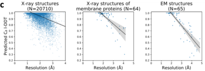 一种有效的精度预测方法应该有助于评估和识别实验确定的结构和计算模型中的潜在误差。文章研究了网络对X射线晶体学、核磁共振波谱学(NMR)和电子显微镜(EM)所确定的实验结构的性能表现,结果显示对于高分辨晶体结构,DeepAccNet预测的Cβ l-DDT分数接近于1.0,而对于较低分辨率的结构预测结果有所下降。
