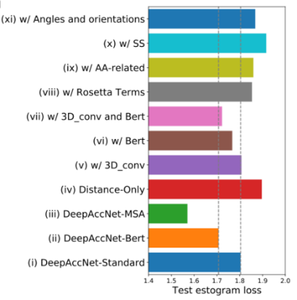 除了距离图特征外,DeepAccNet网络还有以下输入参数:氨基酸的特性和性质、每个残基的局部原子3D环境、主链扭角和残基-残基方向、Rosetta能量项、二级结构信息、MSA以及Bert信息。为了研究这些特征对网络性能的贡献,在训练期间将每一个特征与距离图结合,并通过estogram交叉熵损失和Cβ l-DDT分数均方差在测试集上评估性能。除了MSA特征,最大的贡献来自于基于三维卷积特征和Bert嵌入。