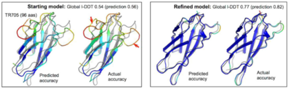 预测模型的改进包括在整体结构正确时识别和修改错误区域,以及在模型的核心部分有些不准确时进行整体协调运动。精度预测网络从两个方面促进了这一整体改进:第一,它在每个可以集中采样的模型的每次迭代中提供了更准确的不可靠距离对和区域的估计,第二,它提供了一种方法,通过残基-残基对约束,在已经精确建模的区域中有效地约束搜索空间。
