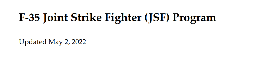 2022 财年国防授权法案: 2022 财年国防授权法案为 85 架飞机(48 架 F-35A、17 架 F-35B 和 20 架 F-35C,这是政府要求的数量)的 F-35 采购提供了 87 亿美元的资金。该法案所附的联合解释性声明包括以下措辞