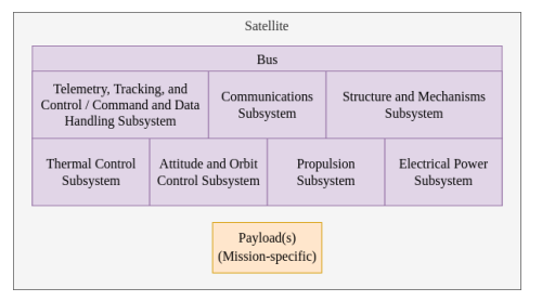 图4-一个卫星通常由一个总线和有效载荷组成,前者为任务提供基础设施,后者执行任务。图中是典型的总线子系统。