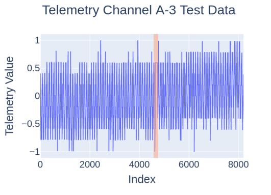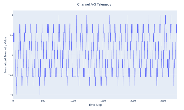 开源数据搜索的最有希望的结果是NASA的一个异常检测库。作为调查ML在遥测异常检测中使用的项目的一部分,NASA喷气推进实验室(JPL)的一个研究小组已经发布了一个数据集,其中包含来自土壤水分主动被动(SMAP)和火星科学实验室(MSL)任务的总共82个遥测通道[23]。这些数据包含了点状异常和背景异常。每个遥测通道都包含每个时间步骤的遥测值以及指令信息。图9显示了来自SMAP航天器的训练遥测通道的例子。训练数据中没有提供地面真相标签,这意味着监督学习方法不能用来直接预测异常情况。测试数据被贴上了地面真相信息的标签,提供了该通道遥测值中存在的任何异常的指数。除了数据本身,开发的算法也同时发布,可以作为基线性能基准。应该指出的是,通道A-3被任意选择作为一个纯粹的开发性数据集;也就是说,训练和测试集都被用来协助开发模型、测试线束和实验。从这个数据集中选择了一个通道,因为它以前被清理、规范化和格式化,作为NASA研究的副产品,供模型摄取。因为这个通道的测试数据已经被多次使用,所以这个通道不能用于评估。相反,将对其余的通道进行评估。